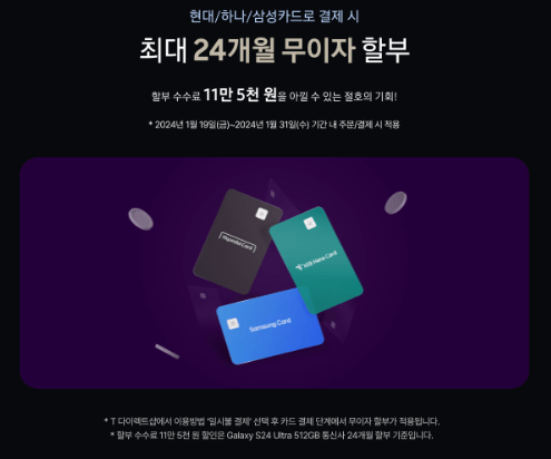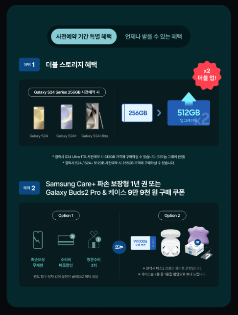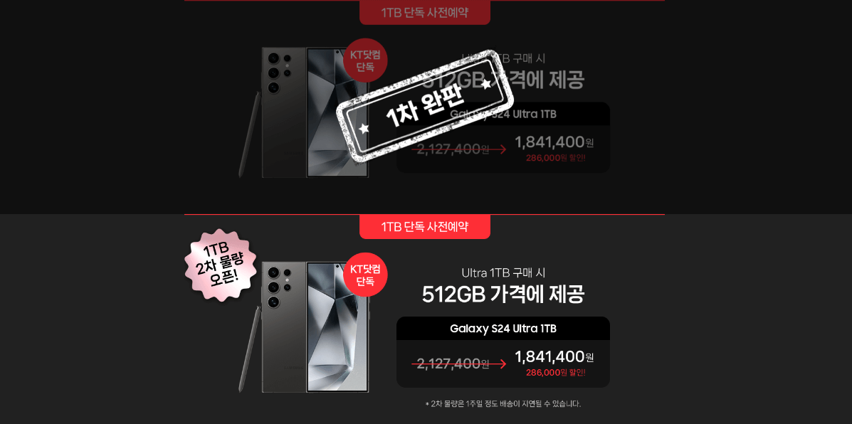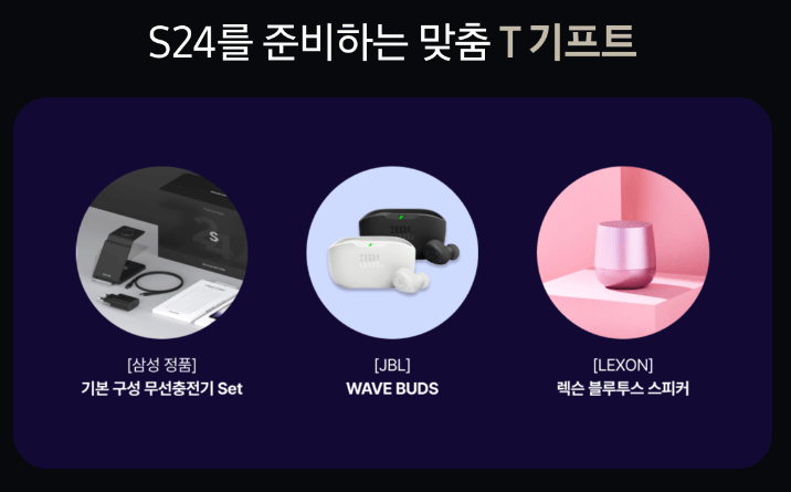 KT는 대한민국 축구 스페셜 혜택으로 축구선수 이강인 소속팀 친필 사인 유니폼을 비롯해 축구 국가대표 A매치 태국전 티켓 등을 경품으로 내세웠다. 지니 TV '브랜드 팝업 스토어' 전용관을 통해 사전 예약한 고객에게는 삼성 스마트뷰 월렛케이스, KT닷컴 모바일 할인권, 지니 TV 쿠폰 등을 추가로 제공한다. KT는 통신사 중 단독으로 갤S24 울트라 1TB 모델도 출시한다.
