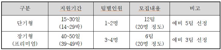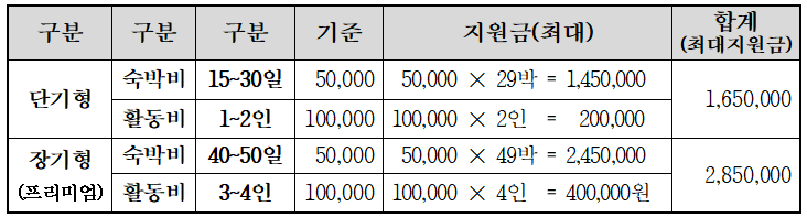 ※ 최소체류기간에 미달할 경우 지원금 미지급(단기형 14박, 장기형 39박)