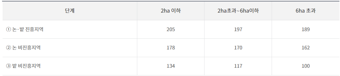 ▶ 면적직불금 자격 요건 면적직불금은 소농직불금 자격에 해당되지 않는 농업인이 신청 가능하며, 소농직불금은 지원금(130만 원)이 정해져 있지만 면적직불금은 아래 유형과 구간별로 지원금이 책정됩니다.