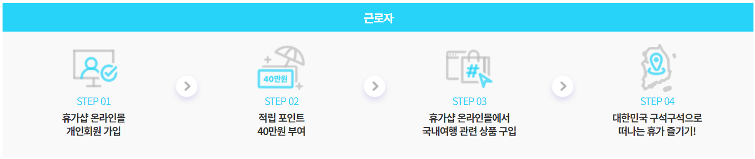 참여 근로자는 온라인몰 휴가샵에서에서 개인회원 가입 후 여행적립금 40만원이 정상적으로 적립되었는지 확인하시면 됩니다. 단, 휴가샵 회원가입은 개별 안내를 받은 후 회원가입 절차가 진행됩니다. 회원가입 후 여행적립금 40만원으로 숙박, 관광지, 입장권, 체험상품, 패키지여행, 교통편 등 다양한 국내여행 관련 상품을 자유롭게 구매할 수 있습니다.