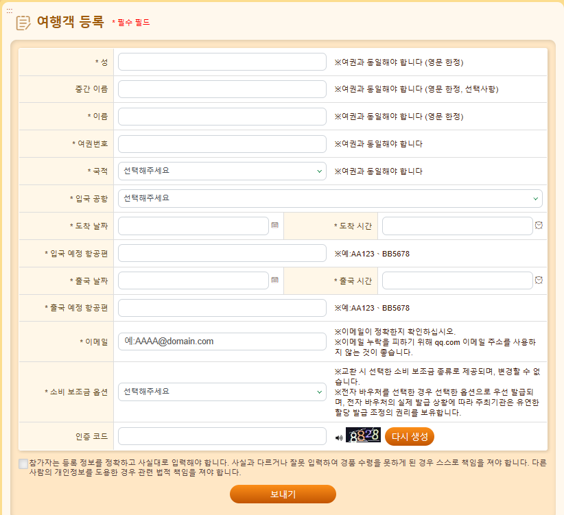 여행객 정보 사전 등록 시 소비지원금 종류를 전자 바우처 또는 숙박 할인쿠폰 중 원하는 혜택 1가지를 선택해야 합니다. 참여 등록 완료 후에는 시스템 내에서 자동으로 추첨 QR 코드를 여행객이 기재한 이메일 주소로 발송합니다.