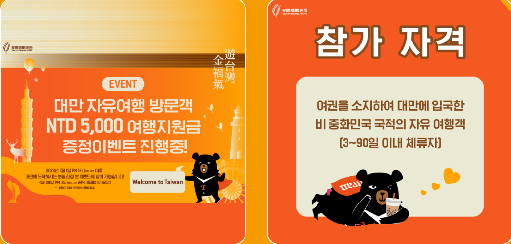 대만 여행지원금 행사 이벤트 기간은 모두 대만 현지 시간(UTC/GMT +08:00)을 기준으로 하여 항공권에 기재된 대만 도착시간 2023년 5월 1일 정오 12시부터 2025년 6월 30일까지입니다. 연도별로 예산이 정해저 있어 선착순으로 인원이 정해지니 그동안 대만 여행 고민하셨던 분들이나 여행경비 절약하고 싶으셨던 분들은 대만 도착시간의 일주일 전부터 신청 가능하며, 최소 하루 전까지는 미리 신청을 완료하셔야 합니다.