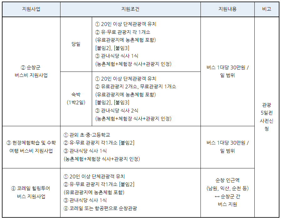 - 순창군 관광객 버스비 지원사업은 버스가 아닌 일반차량은 지원 제외함