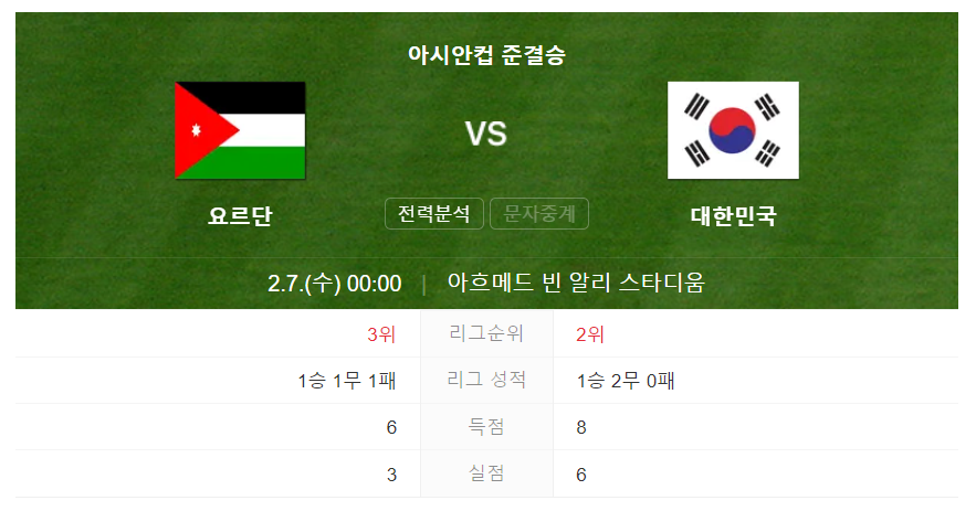 요르단과의 2023 AFC 아시안컵 준결승에 나설 남자 축구 국가대표팀의 선발 명단이 발표됐다. 위르겐 클린스만 감독이 이끄는 남자 축구 국가대표팀이 7일 0시 카타르 알 라이얀 아흐마드 빈 알리 스타디움에서 요르단과 2023 AFC 아시안컵 준결승을 치른다. 한국은 이번 경기 승리 시 하루 늦게 열리는 이란과 카타르 간 준결승 승자와 결승에서 맞붙는다. 한국과 요르단은 이번 대회 조별리그 E조에 함께 속해 한 차례 맞붙은 바 있다. 당시 양 팀은 2-2 무승부를 거두며 승부를 가리지 못했다.